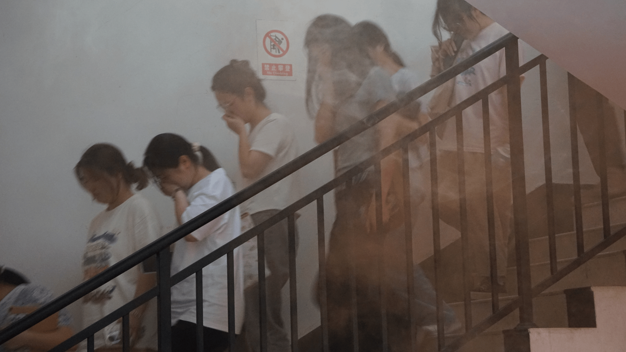 当日下午5:25分,演练正式启动。模拟实训楼内某实验室因电器故障引发火灾,烟雾迅速蔓延。火灾警报响起后,现场指挥立即下达疏散指令。应急疏散组成员迅速响应,引导学生用湿毛巾捂住口鼻,按照预定疏散路线,弯腰低姿、有序撤离。楼层安全员坚守岗位,协助师生疏散,并及时检查各教室、实验室,确保无人员遗漏。整个疏散过程紧张有序,仅用时4分钟,全体师生就安全集结至指定区域。