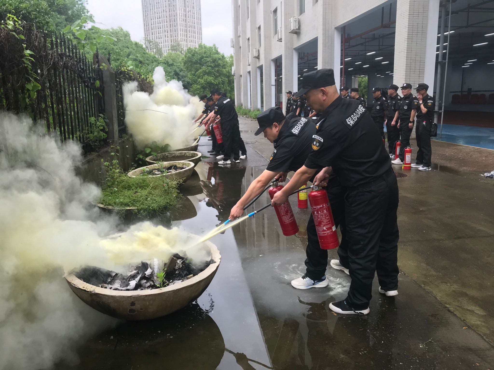 会后,全体保安在体育馆负一楼北侧空坪处进行灭火器实践操作演练,以提升每位安保人员正确使用灭火器扑灭初期火灾的基本能力。