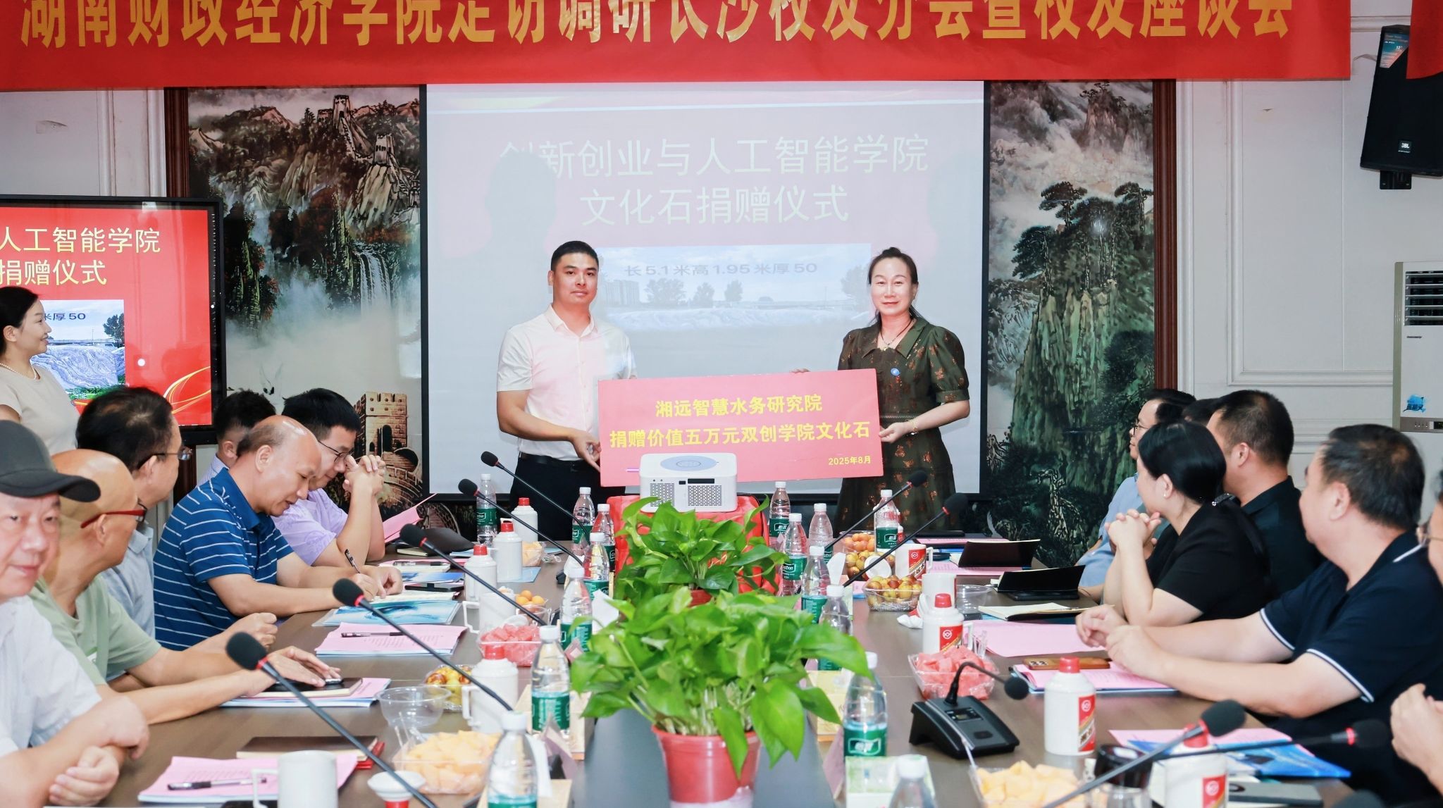 为响应省委省政府推进大学生创新创业的号召,学校今年成立了创新创业与人工智能学院。会上,2006级校友、湘远水务科技股份有限公司、湖南航天康达管业有限公司总经理康栋梁为支持母校双创事业发展,捐赠价值5万元的文化石。苏玲为其颁发捐赠牌匾,以感谢他的爱心善举。