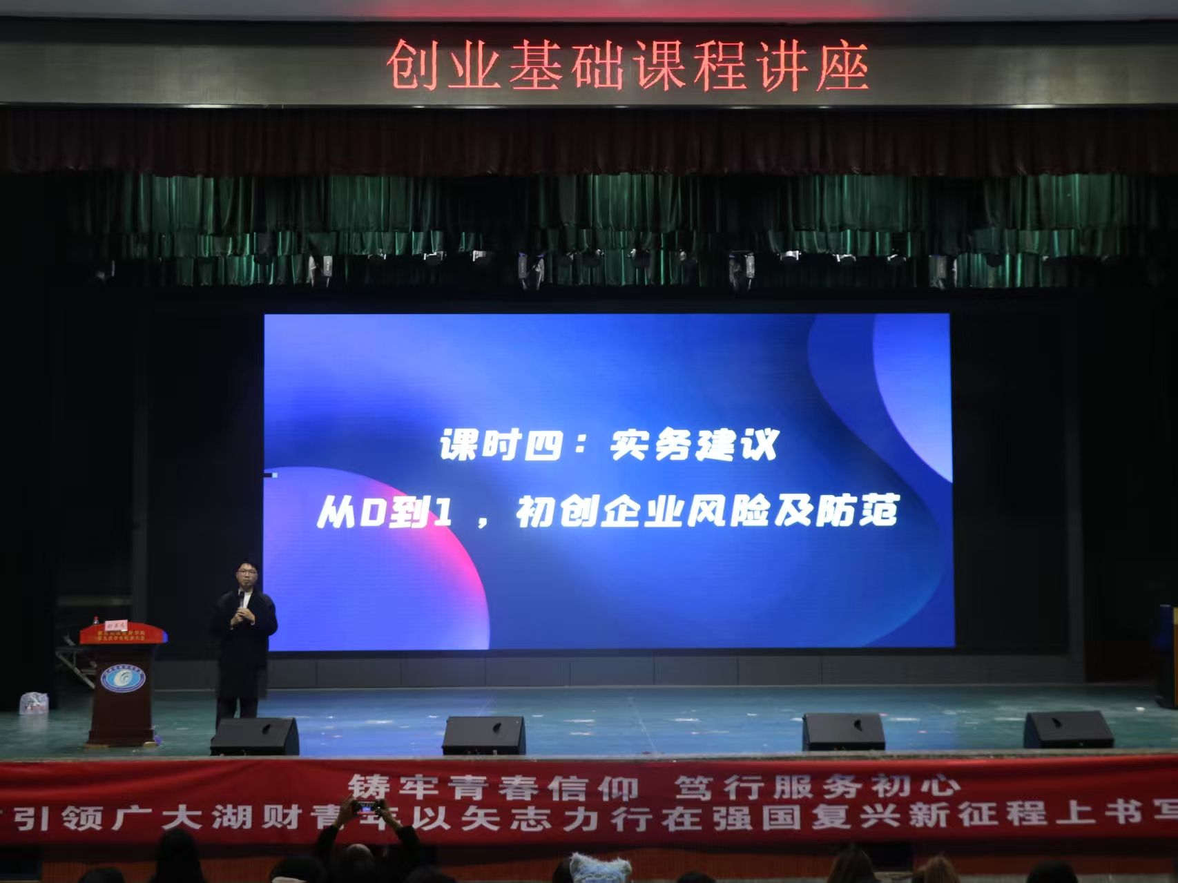 12月10日晚,系列讲座首讲顺利开启,“初创企业管理与风险防控实战 —— 企业家进校园活动” 在大礼堂正式举行。创新创业与人工智能学院直属党支部书记余华、大学生创新创业指导教研室主任周雪、创新创业指导科吴云出席讲座。资深创业者、优秀校友刘正友以 “初创与风险” 为核心,通过创业者分享、知识讲解、案例分析三大板块,为学生带来兼具理论深度和实践价值的专题分享。