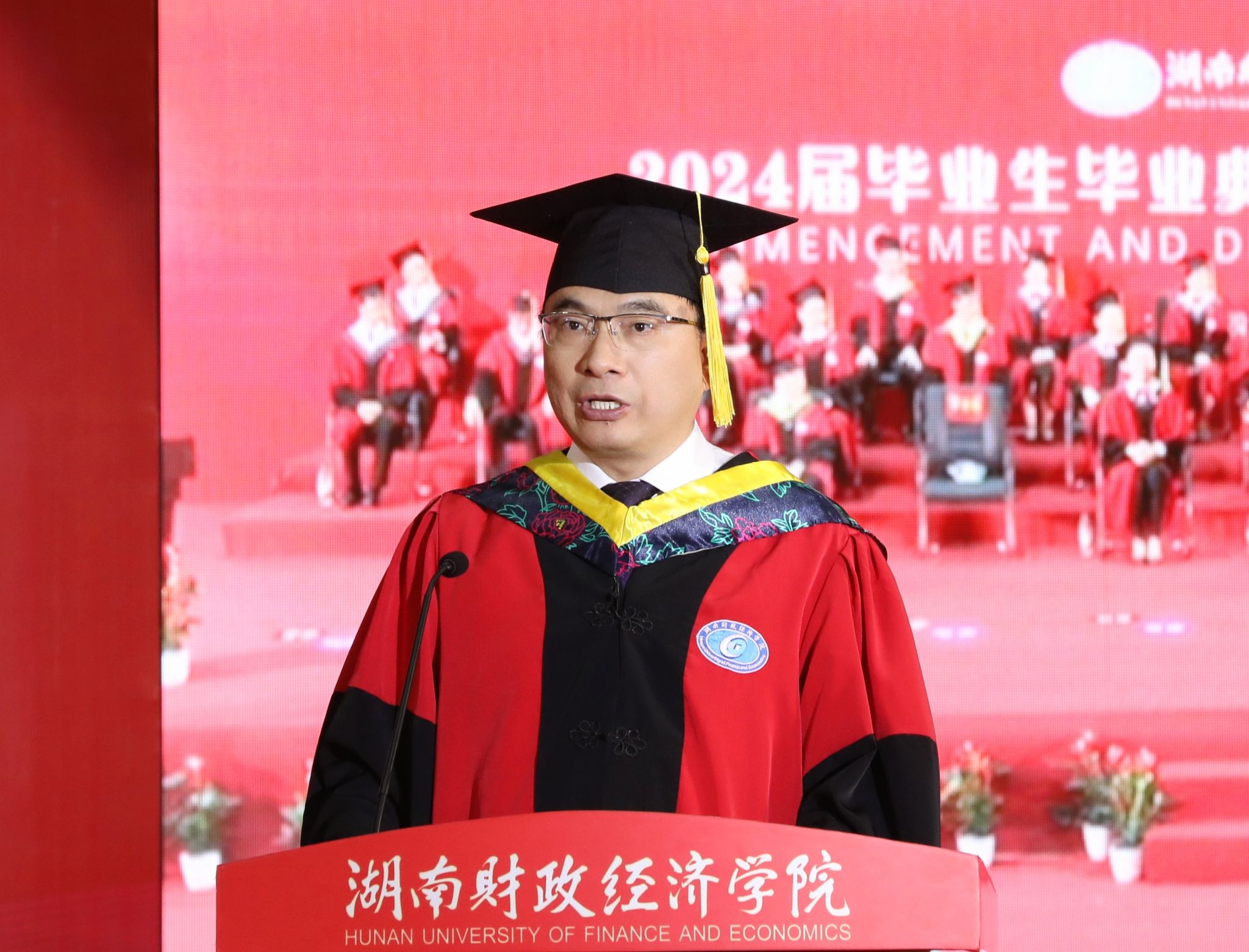 副校长郭国强宣读关于准予2024届毕业生毕业暨学士学位授予决定的相关文件,校党委副书记苏玲宣读《湖南省教育厅关于表彰湖南省普通高等学校2024届优秀毕业生和创新创业优秀毕业生的通报》,校长刘长庚为优秀毕业生代表颁发荣誉证书。