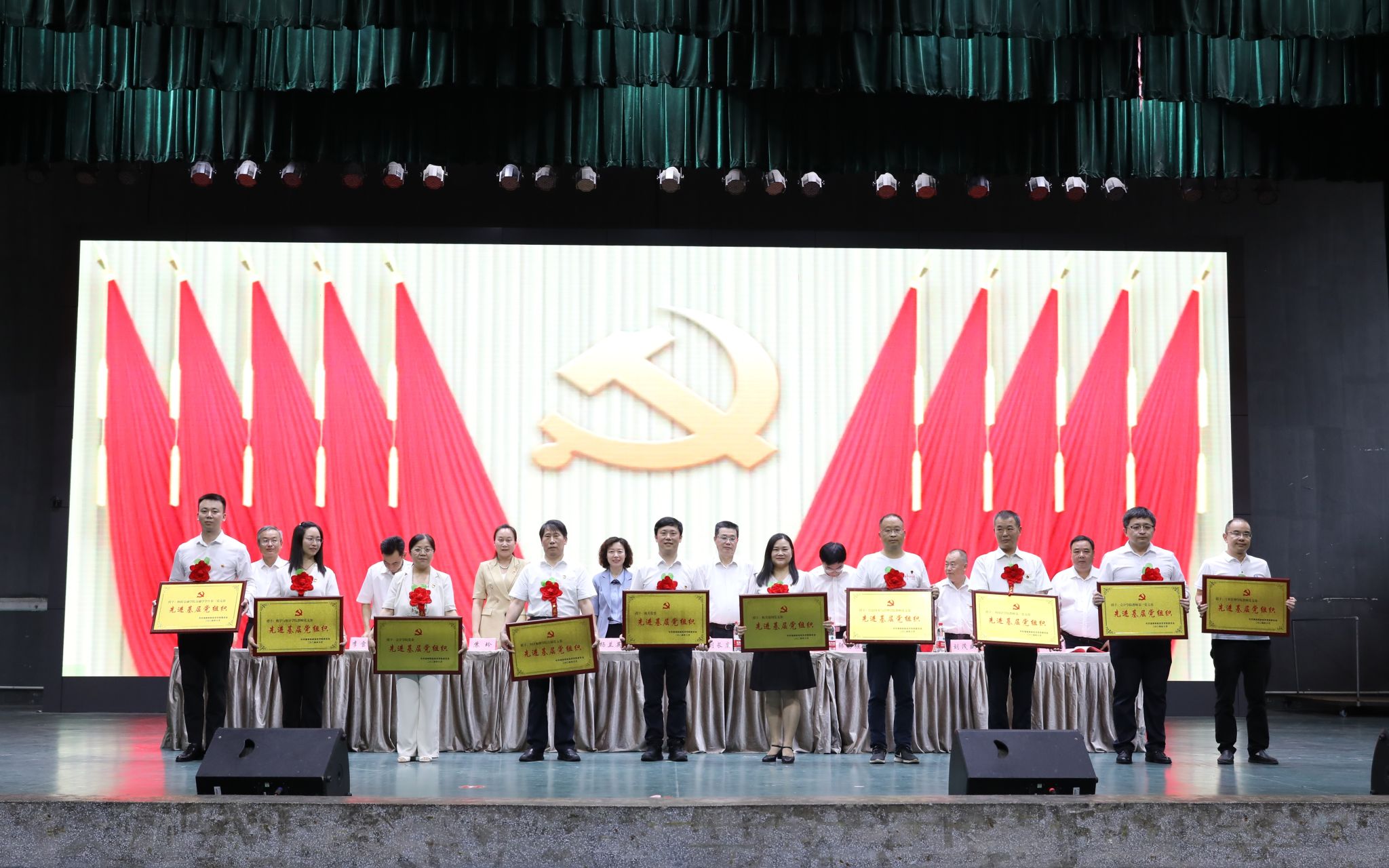 下午3时,表彰大会开始,全体起立,奏唱国歌。在校党委副书记苏玲带领下,全体党员面向党旗,高举右手,庄严宣读了入党誓词。副校长郭国强宣读了《关于表彰2023-2024年度优秀共产党员、优秀党务工作者和先进基层党组织的决定》,学校领导为“光荣在党50年”老党员代表颁发纪念章,为39名优秀共产党员、10名优秀党务工作者和10个先进基层党组织代表颁发奖牌和荣誉证书。会上,学校特意为7月1日入党的党员同志,集体举办“政治生日”仪式,校纪委书记李雪山为他们赠送了“政治生日”贺卡。