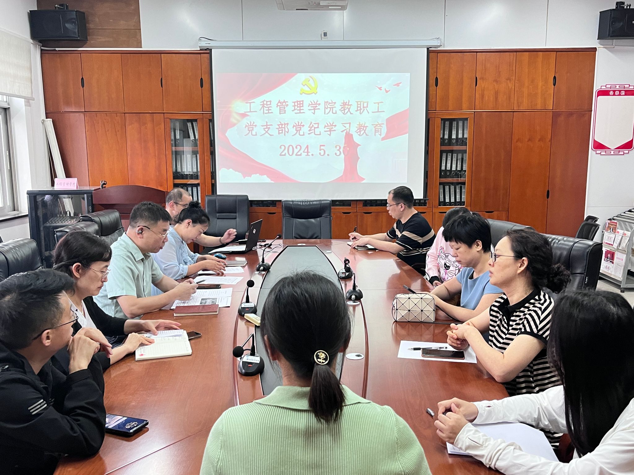 (本网讯)5月30日下午,工程管理学院在办公楼911开展教职工党支部党纪教育学习。会议由向占宏主持,全体支部党员参加。