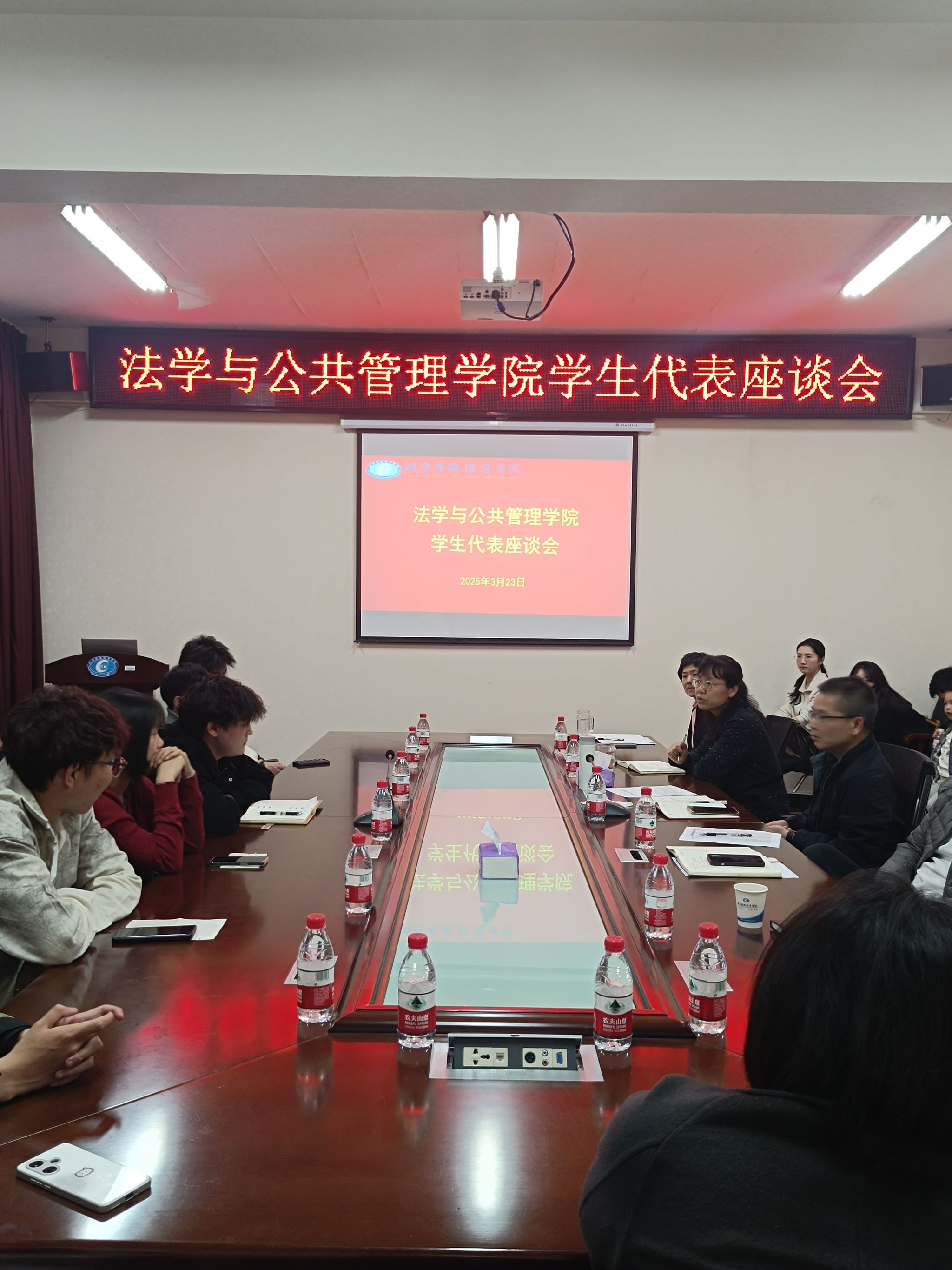 (本网讯)为进一步深化教育教学改革,提升人才培养质量,3月23日晚7点,法学与公共管理学院在414-2会议室组织召开学生代表座谈会,围绕教学方式、教学内容、教学效果及人才培养方案的科学性展开深入研讨。学院班子成员、党委委员、系主任、教师代表及全院各班级学生代表共50余人参加会议,现场气氛热烈。