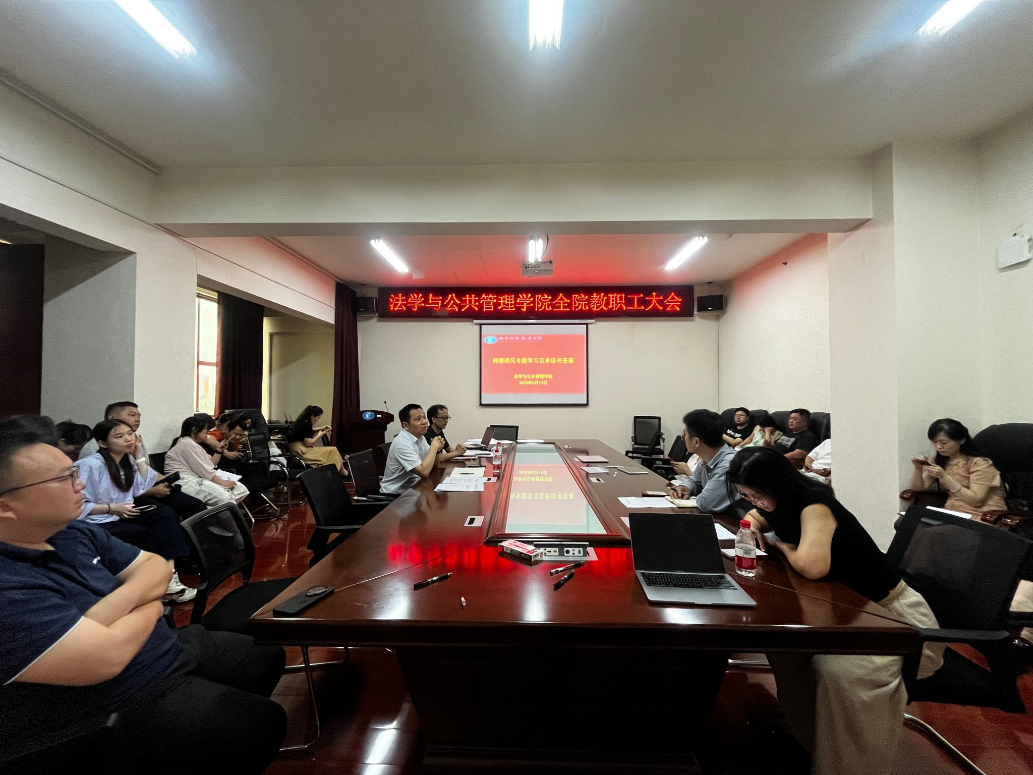(本网讯)为进一步强化教师职业道德建设,营造风清气正的教育生态,5月14日下午,法学与公共管理学院在办公楼414-2会议室召开师德师风专项学习会议。会议由学院党委副书记李茂华主持,全体教职工参加学习。