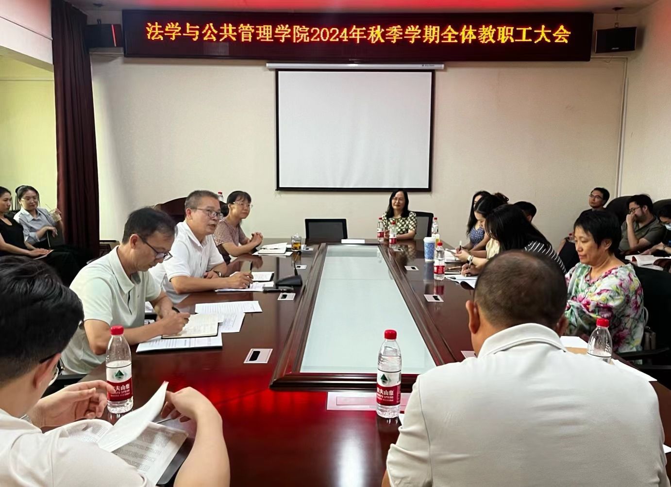 (本网讯)秋风送爽,金菊飘香,法学与公共管理学院于9月5日下午在办公楼414-2室召开秋季学期全体教职工大会,旨在统一思想、凝聚共识,为新学期的各项工作指明方向与目标。会议由院党委书记何四海主持,学院领导班子成员及全体教职工参加会议。