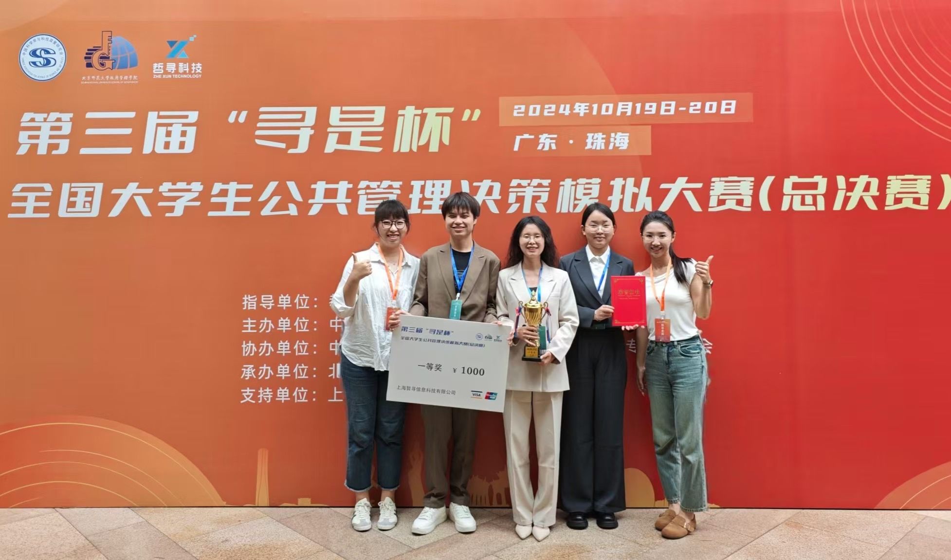 (本网讯)10月20日,法学与公共管理学院在第三届“寻是杯”全国大学生公共管理决策模拟大赛总决赛中传来捷报。由学院行政管理系主任侯丹丹和社会工作系主任刘曼格亲自带队,2021级本科生谢涛、李文艳、骆鹃组成的“益才善水队”,在90支参赛队伍中脱颖而出,荣获大赛一等奖。同时,侯丹丹和刘曼格也凭借出色的指导能力,荣获优秀指导教师奖。