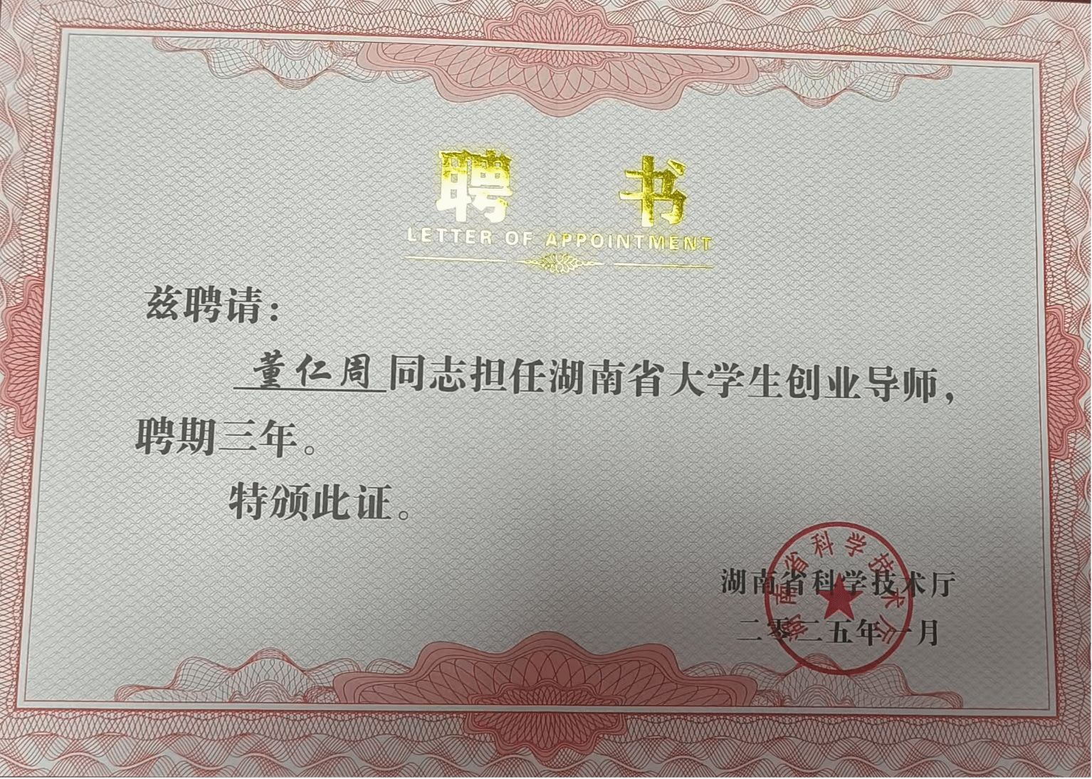 湖南省法务会计研究基地主任、2026世界杯官网法务会计研究所所长、二级教授董仁周博士受聘为湖南省首批大学生创业导师
