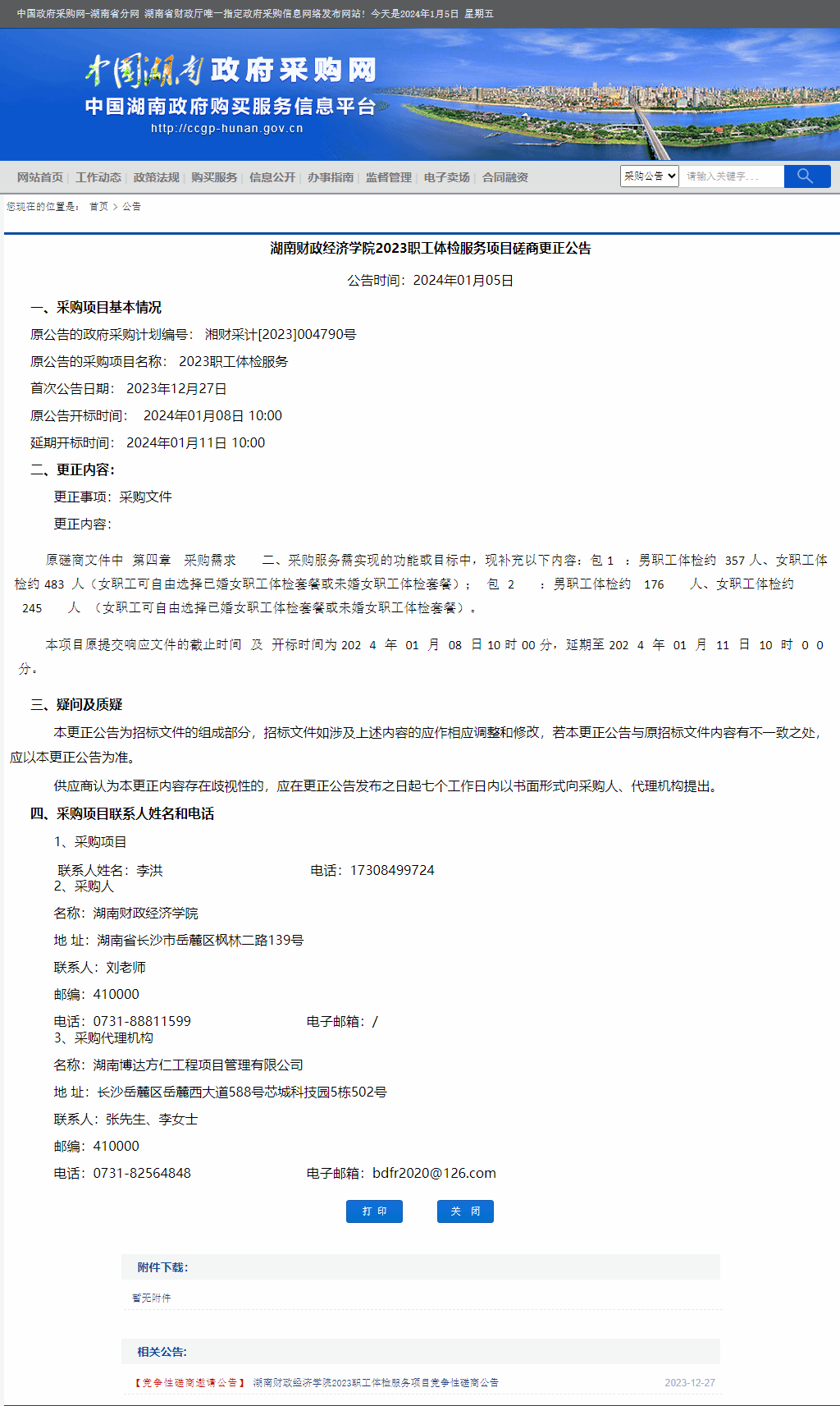 湖南省政府采购网:2026世界杯官网2023职工体检服务项目磋商更正公告