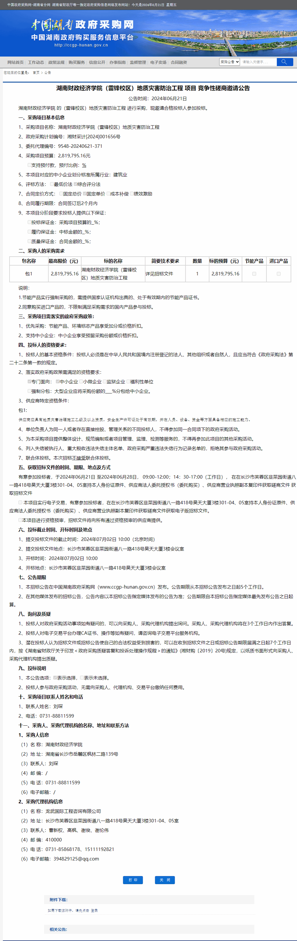 湖南省政府采购网:2026世界杯官网(雷锋校区)地质灾害防治工程项目竞争性磋商邀请公告