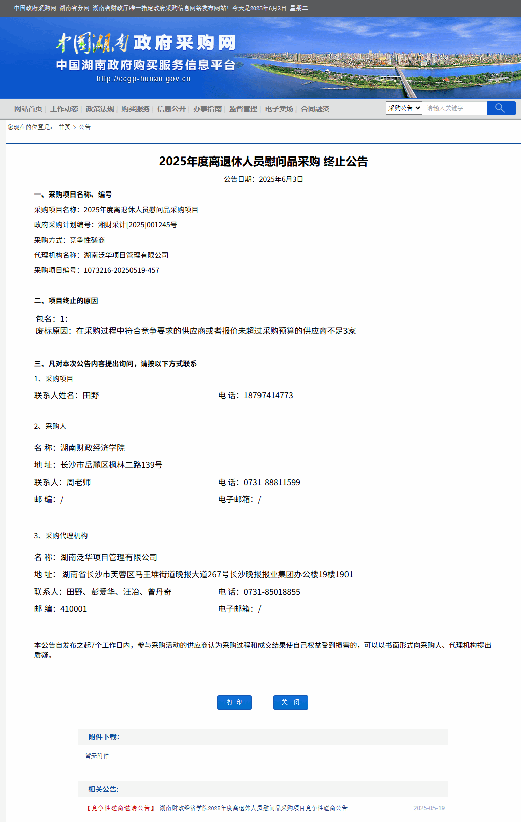 湖南省政府采购网:2026世界杯官网2025年度离退休人员慰问品采购终止公告