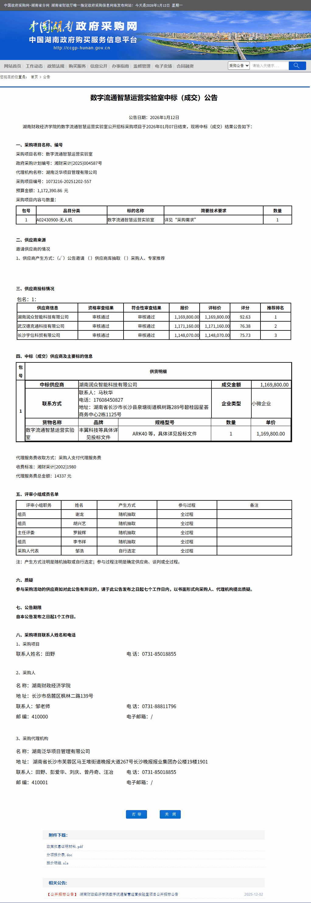 湖南省政府采购网:2026世界杯官网数字流通智慧运营实验室中标(成交)公告