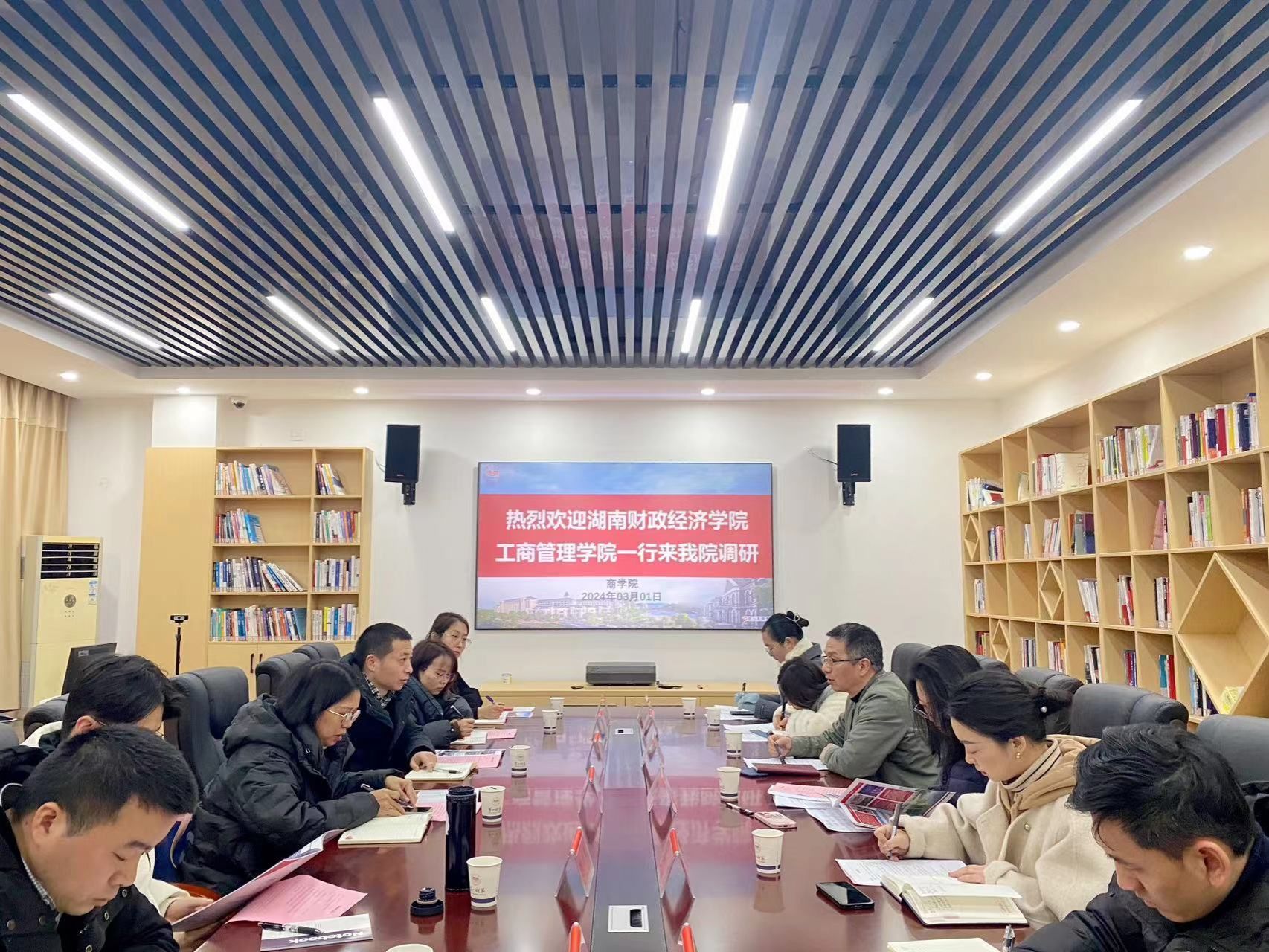 (本网讯)3月1日下午,工商管理学院院长杨鹏一行赴湖南第一师范学院进行调研交流。湖南第一师范学院商学院院长王朝晖热情接待我院调研学习人员,双方进行了座谈交流。