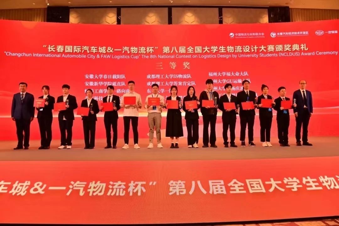 (本网讯)2024年5月26日,“长春国际汽车城&一汽物流杯”第八届全国大学生物流设计大赛在长春汽车职业技术大学圆满落幕。世界杯官网代表队与天津大学、华中科技大学、北京交通大学、长安大学、西南交通大学等众多985、211高校的参赛队伍同台竞技,发挥出色。世界杯官网工商管理学院参赛团队“汽”贯长虹队(指导教师:高昕欣老师、杨鹏教授),由22级物流管理专业的廖霨榛(队长)、何雯宇、胡书昊,21级物流管理专业的钟财龙和22级数据科学与大数据技术专业的罗岩5位同学组成,参赛作品《新质生产力赋能长春一汽物流园区高质量发展方案设计》荣获全国三等奖,5位同学均获得了《物流职业能力等级证书(中级)》(中物联)。