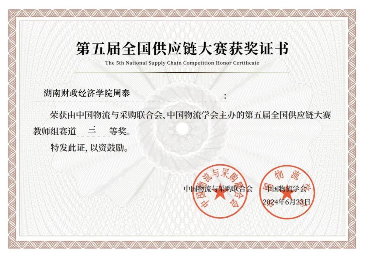 带队老师周泰贯彻“言传身教”教学理念,为更好体会大赛氛围以及实际操作,周泰在指导学生的同时参加了(教师组)的全国供应链大赛。在激烈的竞争中,周泰老师凭借扎实的专业基础、敏锐的市场洞察力和卓越的应变能力,从众多参赛队伍中脱颖而出,最终荣获三等奖。这不仅展示了他在供应链管理领域的深厚功底,也彰显了世界杯官网在储备高素质供应链人才方面的显著成效。