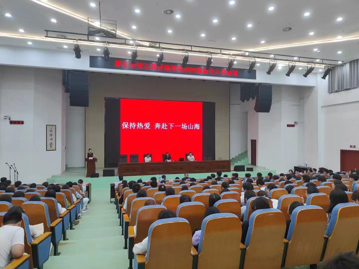 (本网讯)9月14日下午,工商管理学院2024级本科生新生入学教育大会在雷锋学院至诚楼L1114教室召开。院党委书记王跃军主持会议,院长杨鹏、副院长梁辉煌,优秀校友代表,各系负责人、教授代表、教师代表、行政人员代表、优秀学生代表和2024级全体新生参加。