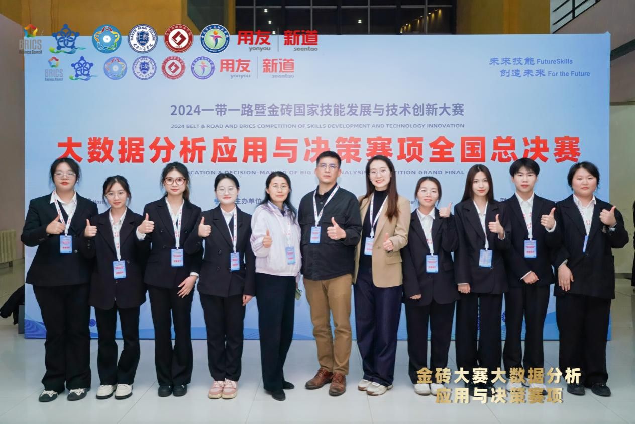 本次赛项由金砖国家工商理事会中方理事会、一带一路暨金砖国家技能发展国际联盟、中国科协一带一路暨金砖国家技能发展与技术创新培训中心主办、中国发明协会、教育部中外人文交流中心联合主办、金砖国家工商理事会技能发展、应用技木与创新中方工作组承办,重点考察参赛学生在数智企业实际工作场景中综合运用数据分析进行决策的综合能力。营销和人力大数据两个赛道共有来自全国30个省、市、自治区的90余支队伍参赛。由工商管理学院陈春燕、卢艳老师带队的队伍(队员:齐乾、彭依、熊丽、朱玲辉)以全国第一名的成绩斩获营销大数据赛道全国一等奖;由工商管理学院邓华强、李芝山老师带队的队伍(队员:王馨莹、李范明、周莹莹、文心语)获得人力大数据赛道全国一等奖,值得一提的是,人力资源队伍在该赛事上已蝉联两届全国一等奖。