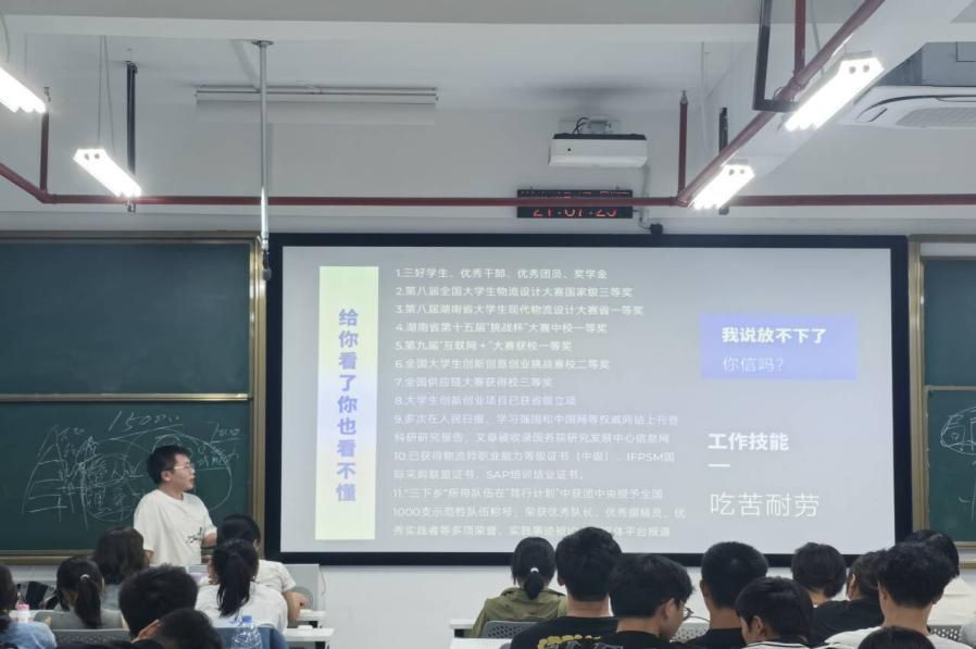 本次指导大会,还邀请了19级优秀毕业生,长沙理工大学研究生胡俊向新生介绍学习经验。他以“物流管理专业是什么”这一引人深思的问题开场,他的分享不仅带动了全场气氛,更向同学们展示了自己从本科生到研究生的蜕变之旅。