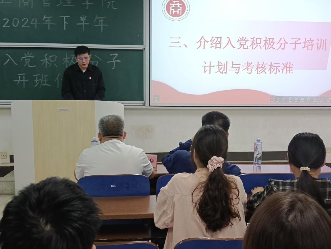 (本网讯)10月16日晚,工商管理学院2024年下半年入党积极分子培训班开班仪式暨党课培训活动在3503教室举行。工商管理学院党委书记王跃军出席开班仪式,并为入党积极分子讲授第一堂党课。院党委委员唐力翔、学生第三支部书记邓华强及全体入党积极分子参加开班仪式。开班仪式由学生第三支部宣传委员邱海琪主持。