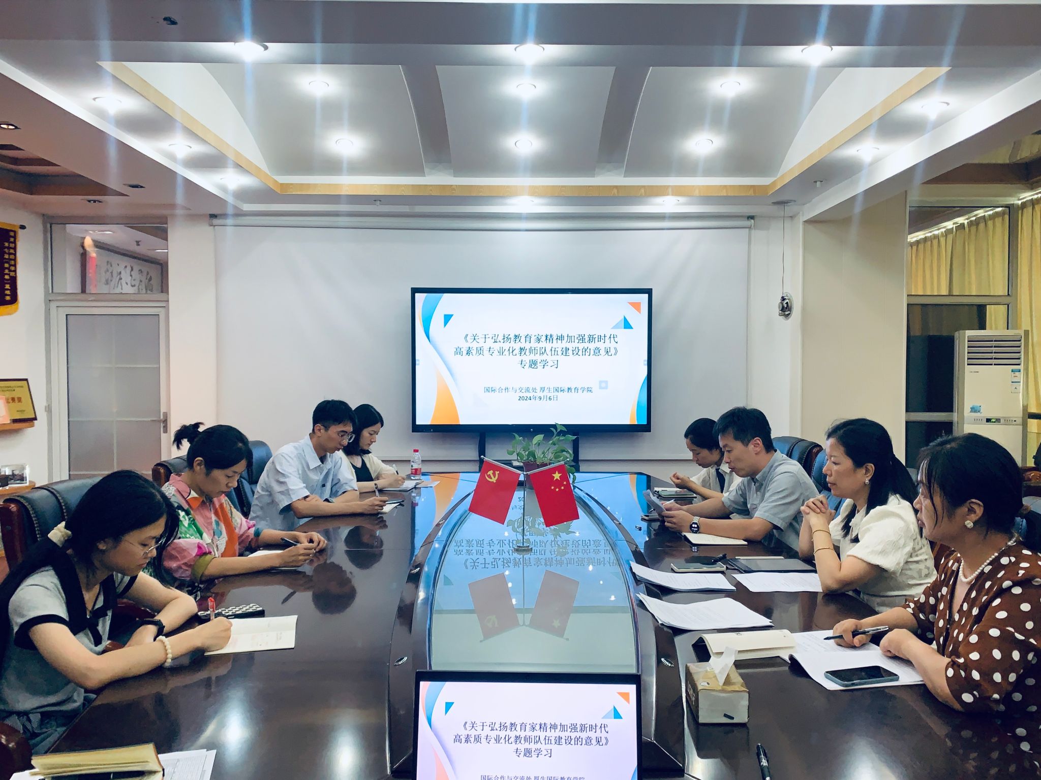 会议首先贯彻落实了第一议题学习,由院直属党支部书记肖平飞带领大家认真学习了《关于弘扬教育家精神加强新时代高素质专业化教师队伍建设的意见》,并详细解读了《2026世界杯官网教师师德失范行为负面清单及处理办法》和《2026世界杯官网教师师德失范行为通报警示暂行办法》;国合处处长傅佳领学了《湖南省教育行政处罚自由裁量基准》,重点学习了与中外合作办学业务相关的非法牟利行为和裁量基准,筑牢大家的思想防线。