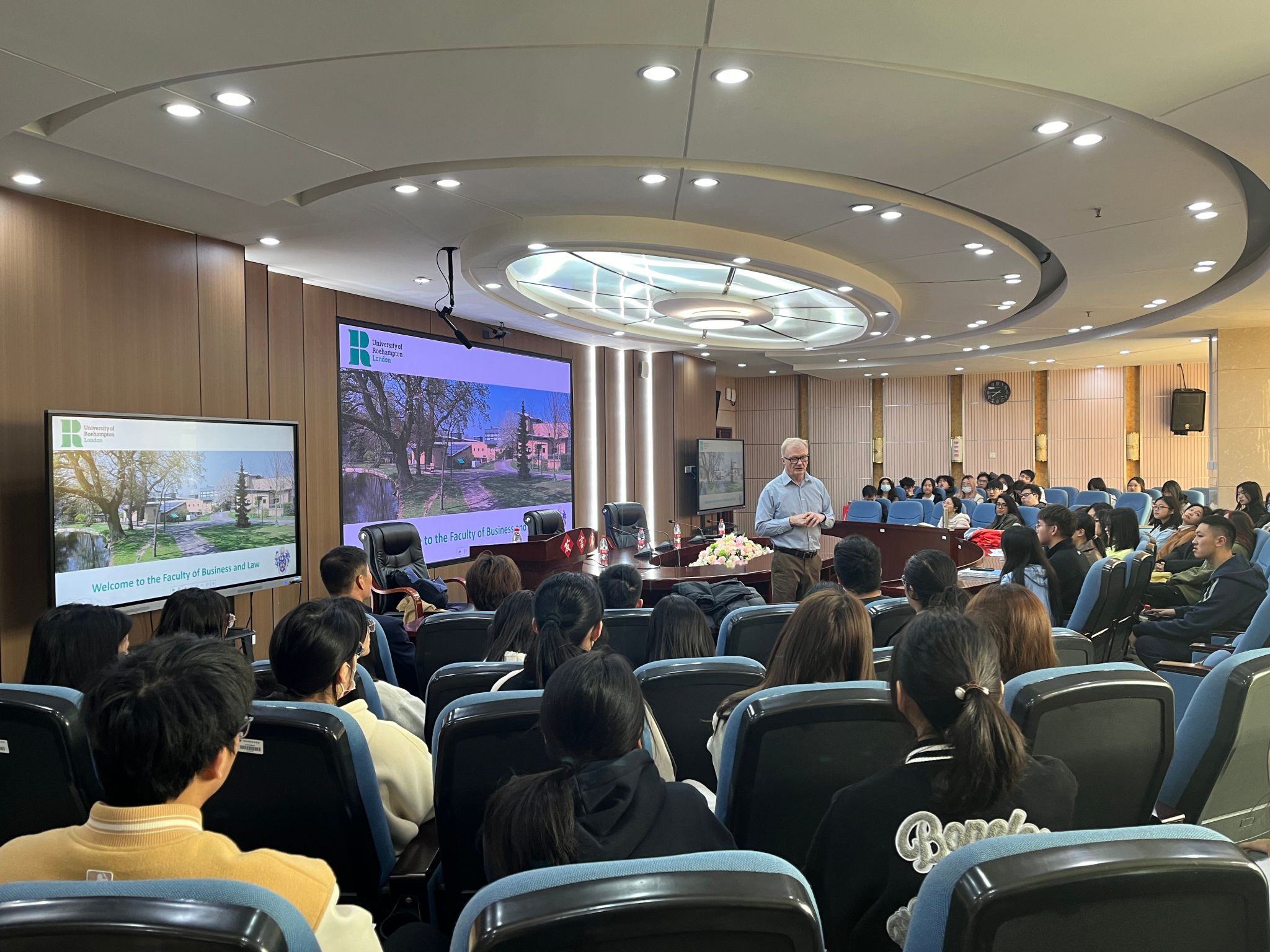 会后,Dr.Stephen举办了学术讲座,向世界杯官网百余名师生详细介绍了英国罗汉普顿大学的教学设施、学科优势、学业情况、校园环境等,并对学生提出的罗汉普顿大学学位授予、学费和消费水平、交通情况等问题进行了解答。