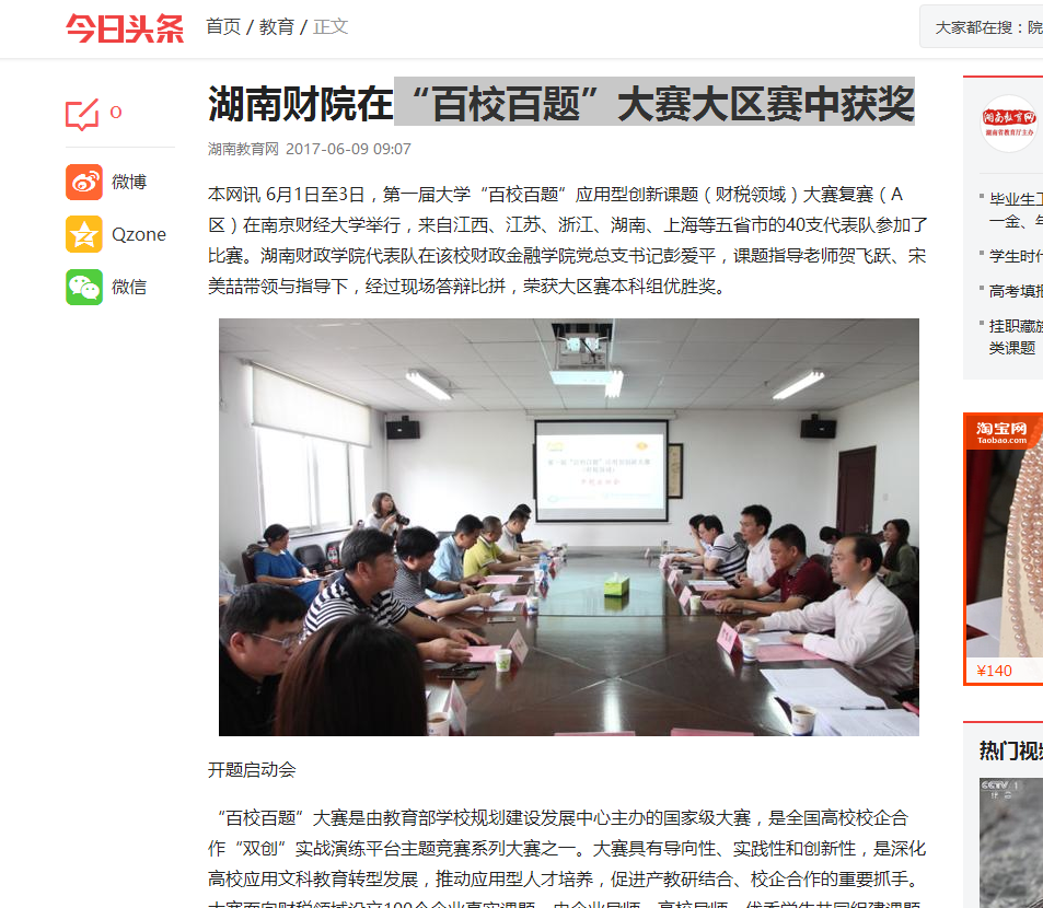 6月9日,湖南教育网在“今日头条”对世界杯官网在“百校百题”大赛大区赛中获奖进行了报道。 报道链接:http://www.toutiao.com/i6429449243160740353/?tt_from=weixin&utm_campaign=client_share&from=group...