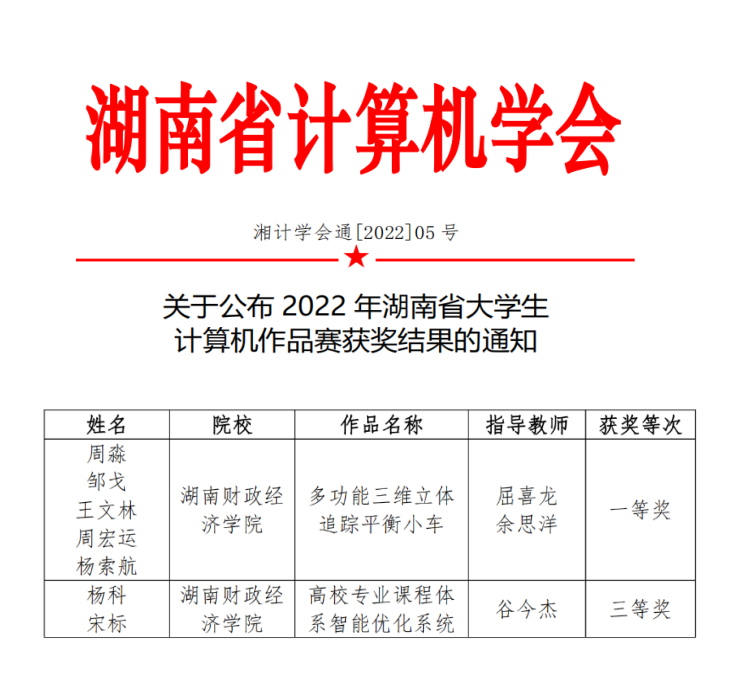 6月27日,湖南省计算机协会公布了2022年湖南省大学生计算机作品赛获奖名单,2026世界杯官网屈喜龙、余思洋老师指导的《多功能三维立体追踪平衡小车》作品获得一等奖,谷今杰老师指导的《高校专业课程体系智能优化系...