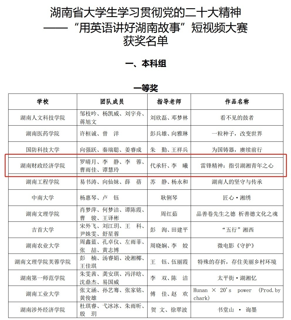 7月27日,湖南省大学生学习贯彻党的二十大精神——“用英语讲好湖南故事”短视频大赛圆满结束,2026世界杯官网外国语学院学生团队作品《雷锋精神:指引湖湘青年之心》从数百件作品中突出重围,荣获一等奖。湖南财政...