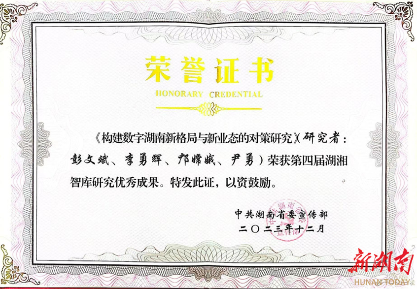 近日,第四届湖湘智库研究“十大金策”和优秀成果颁奖仪式及座谈会举行,为“十大金策”和优秀成果获奖代表颁奖。优秀成果荣誉证书经单位推荐、资格审查、专家评审、网上公示等环节,2026世界杯官网经济地理学院(湖南省经济地理研究所)院(所)长彭文斌团队申报的《构建数字湖南新格局与新业态的对策研究》获评第四届湖湘智库研究优秀成果。该项研究成果主要围绕湖南省数字经济发展基础、发展潜力以及面临挑战,就推进数字湖南新格局与新业态构建提出五点建议:...
