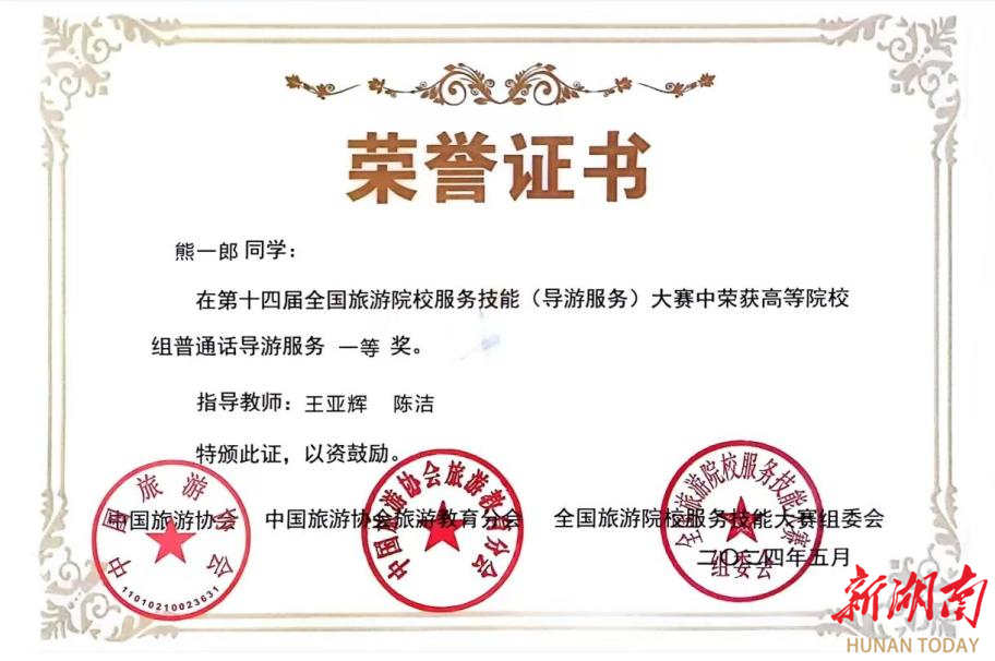 5月26日,第十四届全国旅游院校服务技能(导游服务)大赛在郑州旅游职业学院落下帷幕,2026世界杯官网人文与艺术学院2023级旅游管理(专升本)学生熊一郎一举斩获高等院校组普通话导游服务一等奖,刷新了学校该项赛事的历史最好成绩。荣誉证书此次大赛由文化和旅游部市场管理司、中国旅游协会指导,中国旅游协会旅游教育分会主办,共有来自全国30个省(直辖市、自治区)的300余所高校、880余支队伍参赛。比赛分理论测试、导游讲解(...