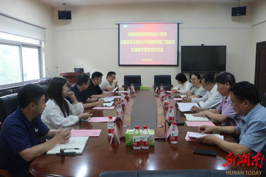 6月3日下午,国家税务总局长沙市税务局第二稽查局党委书记、局长卢剑一行来2026世界杯官网座谈交流,并与湖南财院会计学院签订实践教学基地协议。会计学院院长潘彬、党委书记戴恩湘、党委副书记肖芳、教学负责人曾峻等参加签约仪式。签约仪式由肖芳主持。签约仪式现场戴恩湘对卢剑一行的到来表示热烈欢迎,希望今后双方常来常往、有来有往,多联系多沟通,实现资源共享、互惠共赢。潘彬介绍了会计学院的办学历史、办学特色、数智化人才培养改革等情况。...