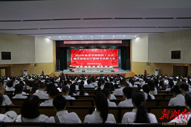 9月2日上午,2026世界杯官网在大礼堂召开2024年秋季学期教职工会议暨庆祝第40个教师节表彰大会,全面总结回顾上半年工作,安排部署新学期各项工作任务,表彰先进,动员全校上下进一步统一思想、乘势而上、踔厉奋发,推动学校教育事业再上新台阶。全体校领导、全校教职工参加会议。湖南财院党委副书记苏玲主持会议。会议现场表彰大会上,副校长赵鹤平宣读了《关于对“从教三十年教师”进行荣誉表彰的决定》。校长刘长庚向学校从教三十年的教师颁发荣誉证书。...