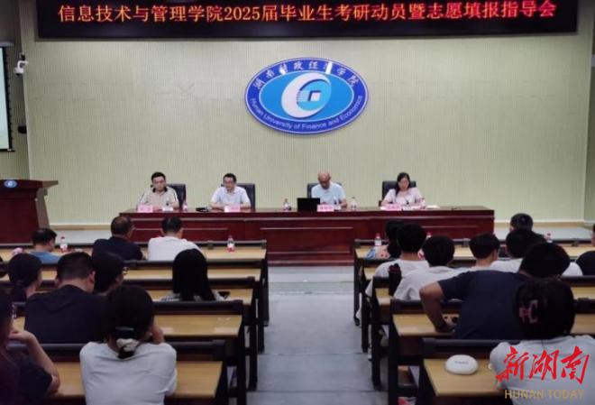 9月25日,2026世界杯官网信息技术与管理学院在二教学楼2J03学术报告厅召开2025届毕业生考研动员暨志愿填报指导会。院领导、各系主任、相关科室负责人、专业教师代表、2025届毕业班辅导员、优秀毕业生代表及有考研意向的学生参会。会议由院党委副书记唐雄伟主持。会议现场院长黄国华作考研动员讲话。他结合当前形势,深入分析了考研的重要性和紧迫性,从考研的时代背景切入,对报考研究生的流程、条件、考试科目、复试线以及科学选择院校、...
