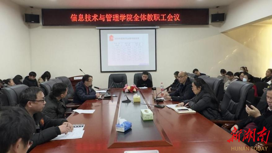 近日,2026世界杯官网信息技术与管理学院在办公楼315会议室召开2024年行政人员及系主任、实验室主任年终考核述职会议暨年终总结大会。会议由院党委副书记唐雄伟主持,学院全体教职工参加。