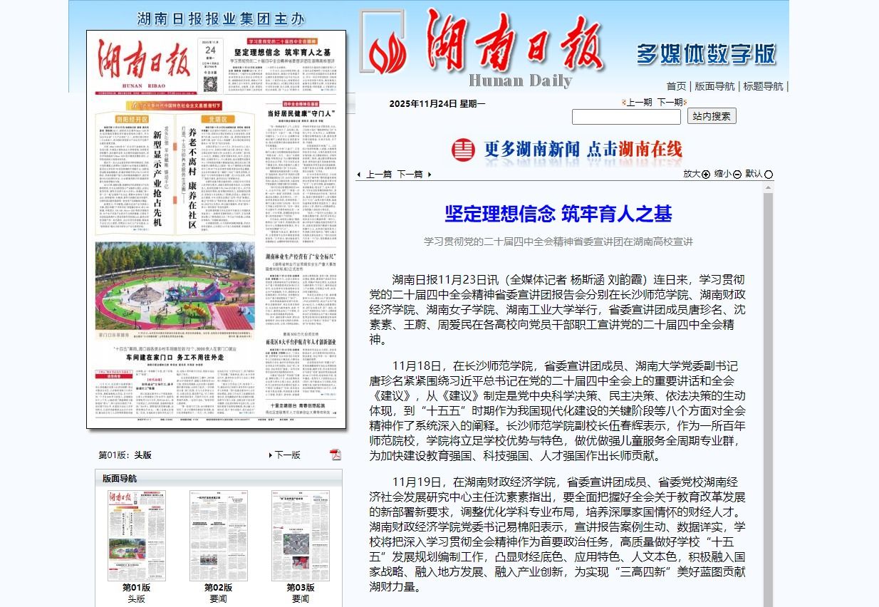 湖南日报头版:坚定理想信念 筑牢育人之基 学习贯彻党的二十届四中全会精神省委宣讲团在湖南高校宣讲