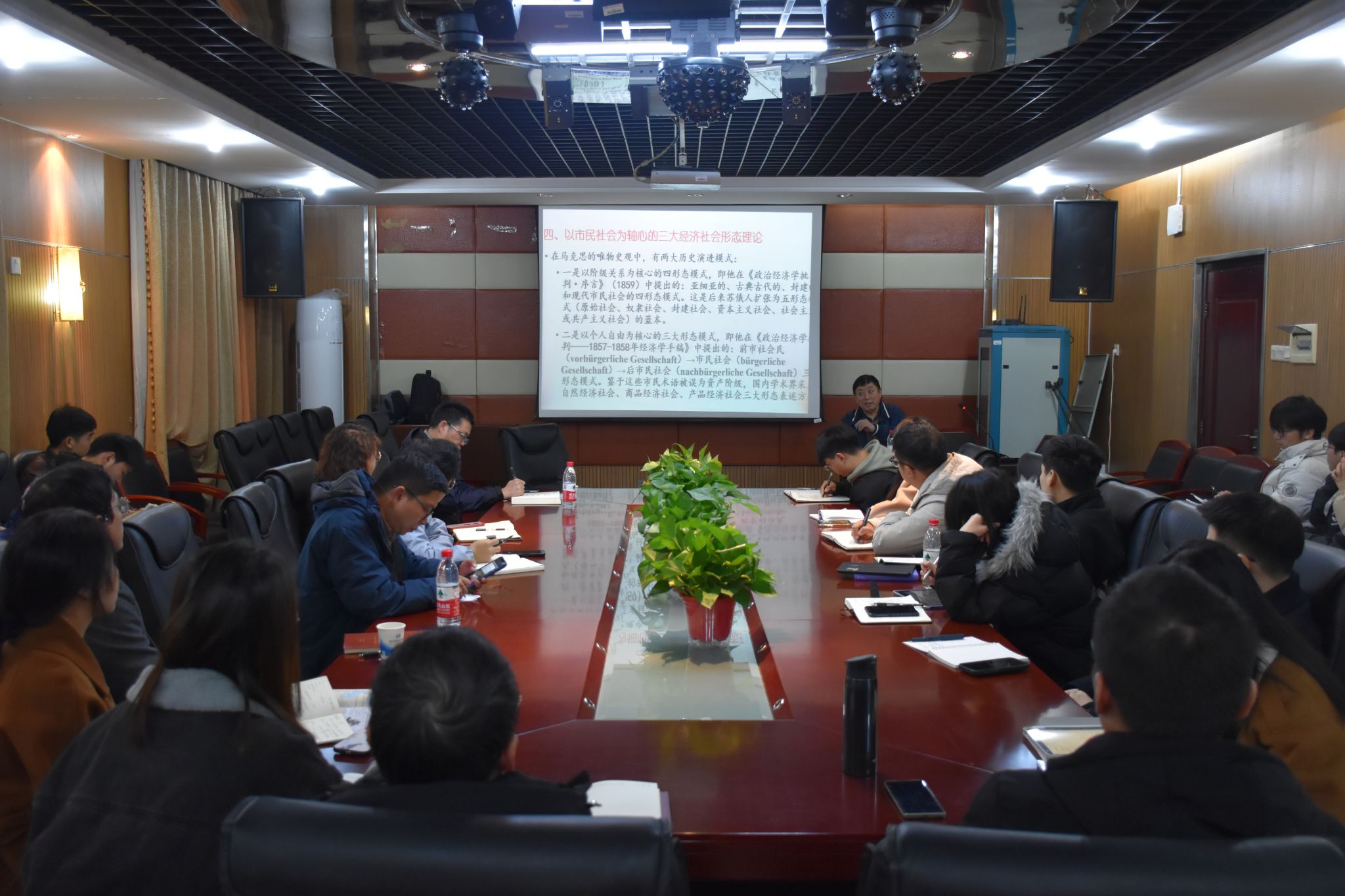 (本网讯)12月3日上午,应经济学院邀请,北京师范大学沈越教授来校作“马克思市民理论的四大组成部分——基于政治经济学的研究”专题讲座。讲座由校长刘长庚主持,科研处处长李勇辉,经济学院副院长彭千芮、专任教师及联合培养硕博士研究生共40余人到场学习。讲座现场沈越认为,现有译著选择性地将马克思、恩格斯著作中“Bürger”这类术语一词两译为市民或资产阶级,与马克思一词一义明晰界定市民与资产阶级两类不同概念的德文原著明显不符。...