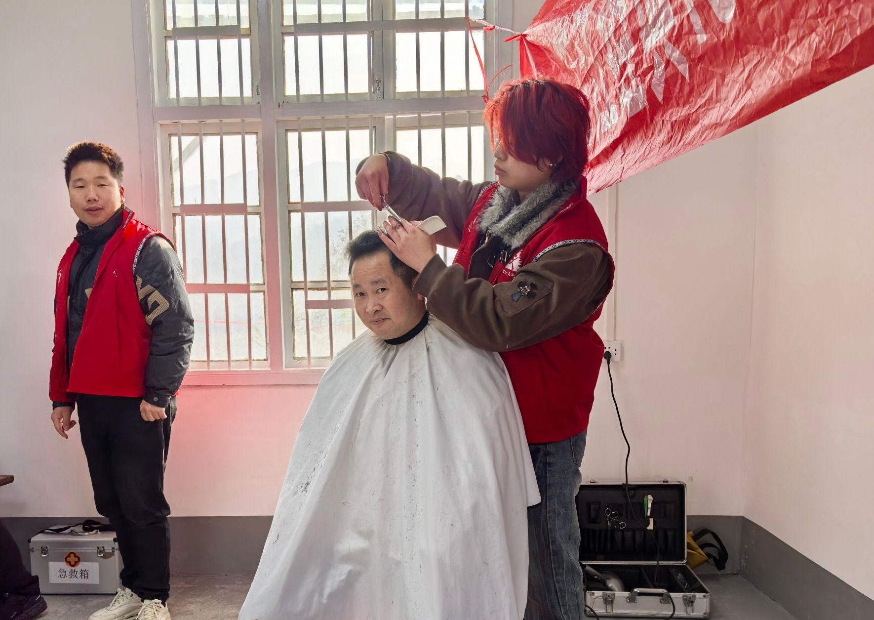 理发师为村民修剪头发