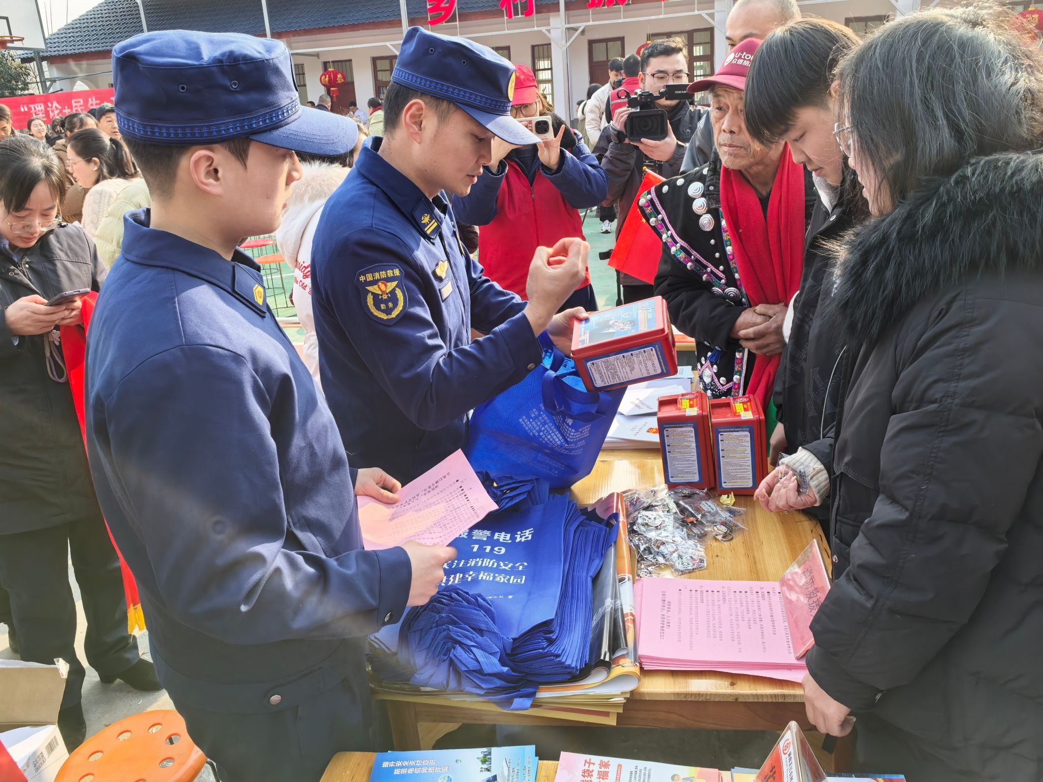 工作人员向过往群众发放宣传资料和小礼品