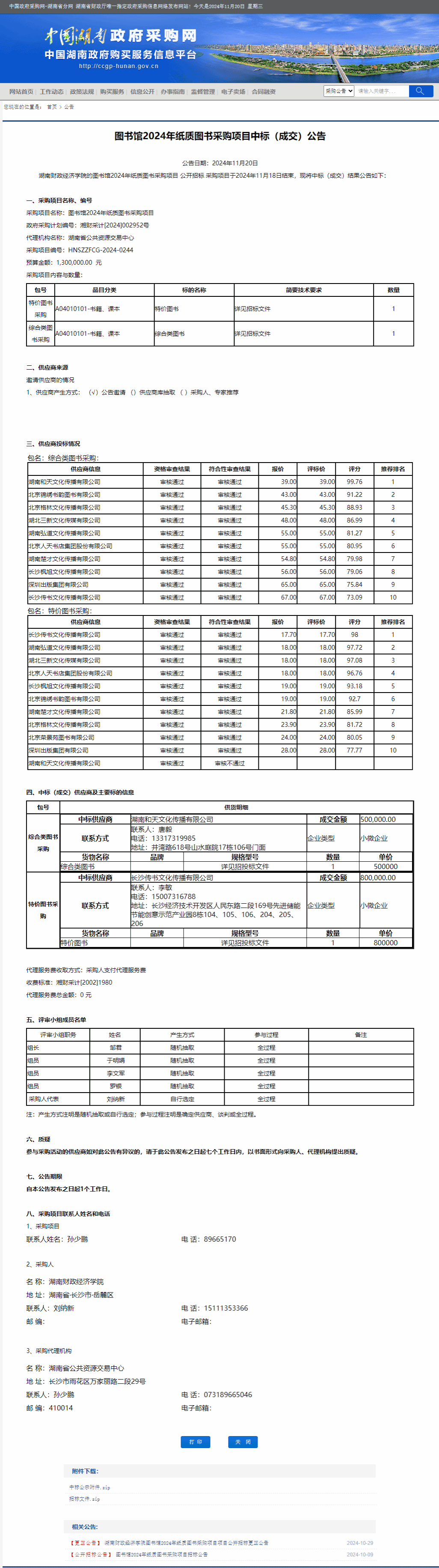 湖南省政府采购网:图书馆2024年纸质图书采购项目中标(成交)公告