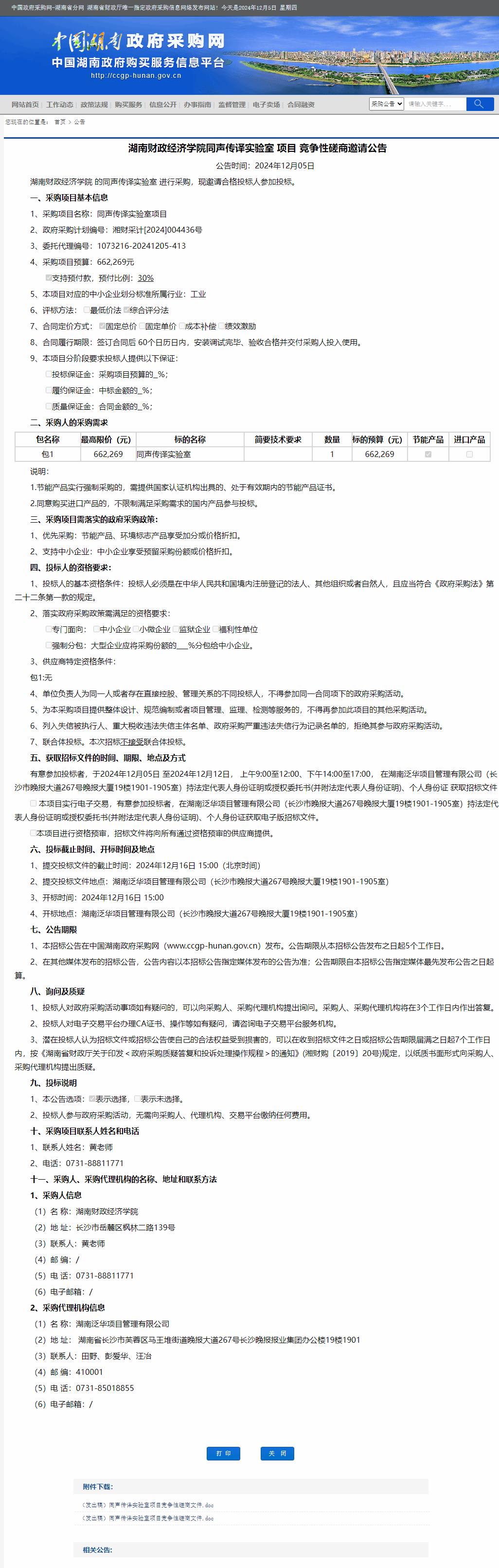 湖南省政府采购网:2026世界杯官网同声传译实验室项目竞争性磋商邀请公告