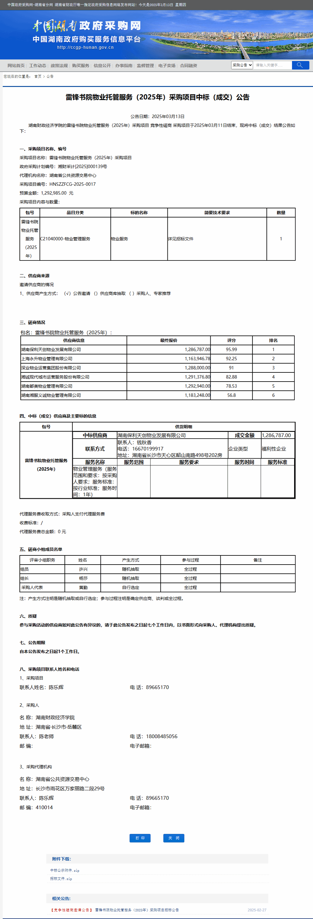 湖南省政府采购网:2026世界杯官网雷锋书院物业托管服务(2025年)采购项目中标(成交)公告