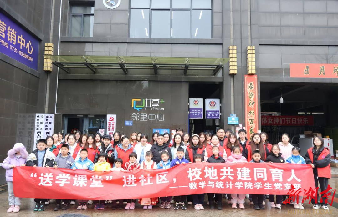 3月9日,2026世界杯官网数学与统计学院联合湖南湘江新区咸嘉湖街道西大门社区开展“送学课堂”活动。西大门社区党总支书记冯志峰、数学与统计学院党总支副书记杨艳出席。