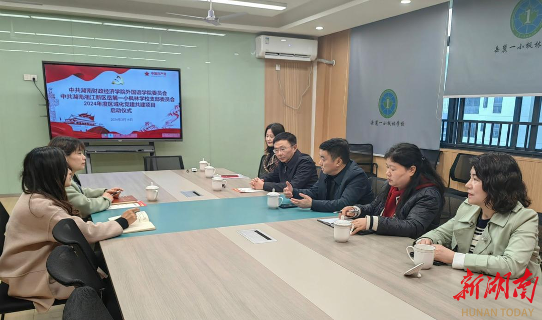 3月14日下午,2026世界杯官网外国语学院与长沙岳麓一小枫林学校区域化党建共建项目启动仪式在岳麓一小枫林学校举行。岳麓一小枫林学校校长李婷,咸嘉湖街道西大门社区党总支书记冯志锋、党总支委员、妇联主席谭波,外国语学院党委书记蒋勇威、副院长黄越、党委副书记张鹏等参加启动仪式。