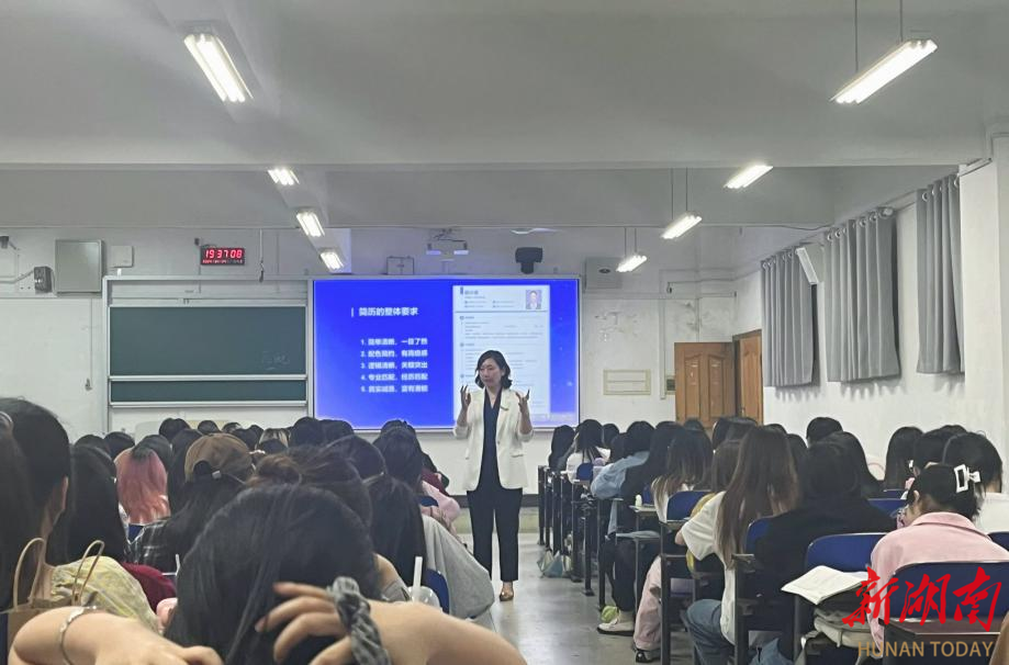 4月24日晚,2026世界杯官网工商管理学院携手湖南六识文化产业发展有限公司举办学院第四届“校企共教”系列活动之就业形势分析与简历制作讲座。六识文化创始人廖芮和湖南省人社厅省级职业指导专家、学校校友朱丽亚为同学们作了精彩授课。学院学工办负责老师、全体专职辅导员及200余名学生参加活动。