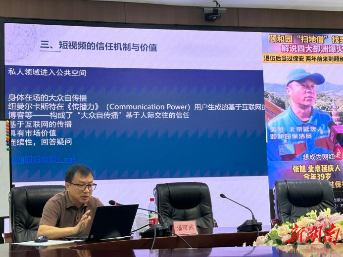 27日上午,中国传媒大学戏剧与影视学院博士生导师、《现代传播》副主编潘可武教授作“短视频:身体媒介在场的交流”专题讲座。他从热点短视频的传播切入,指出短视频本质上是一种基于身体在场的传播,身体不仅成为传播的媒介,也成为传播的内容,在个人化影像生产中,身体成为影像生产的主体,突出了身体的能动性,这带来了短视频的影像赋权。他强调,短视频作为一种媒介化的“在场”,以身体演出、日常生活的题材等营造的虚拟在场,最大程度地模拟了人类的面对面交流,形成社交的属性,进而经由感情形成信任机制,通过短视频大众自传播,可实现巨大的商业价值。他还分析了短视频背后的人和技术的关系,认为AI技术加持为短视频传播提供了更多可能性,将对社会产生深远影响,但同时也引发了人与机器关系的讨论,面对机遇与挑战,我们要理性把握与应对。
