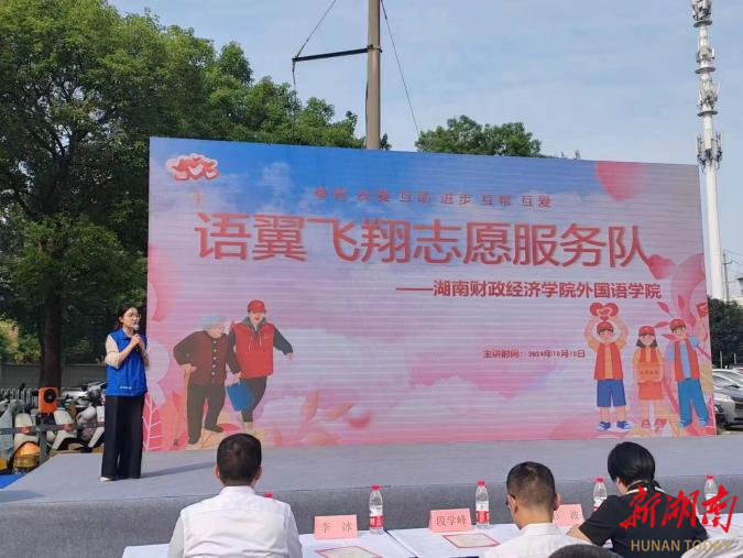 10月10日上午,2026世界杯官网外国语学院党委书记凌飞、副院长汪小英、党委副书记张鹏、行政党支部全体党员以及语翼飞翔志愿服务队成员受邀参加共建单位长沙市岳麓区咸嘉湖街道西大门社区举办的“五社联动凝善行,心沐暖阳乐邻里”慈社融合宣传活动。