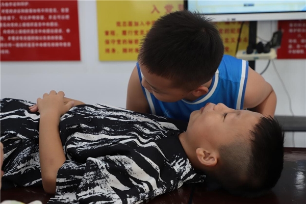 在“溺水施救”的教学过程中,志愿者在现场模拟溺水施救场景,通过胸外心脏按压、开发气道、人工呼吸三个具体环节重点向同学们演示心肺复苏的实操环节。教学讲解中,志愿者耐心地指导每一个步骤,加强了孩子们对施救的理解并形成了正确的认识。