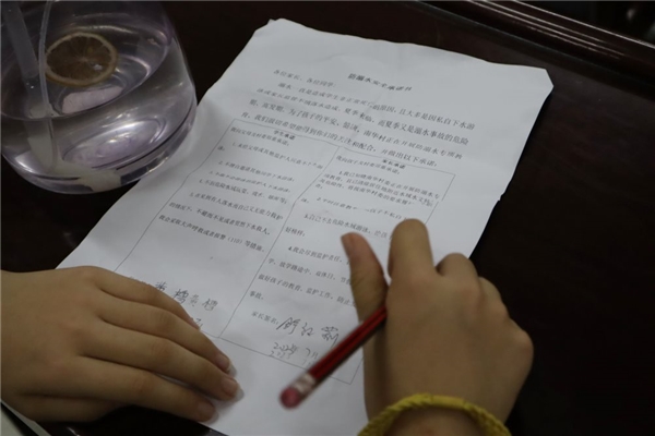 图为家长和孩子们一起签署安全承诺书|易翼博摄
