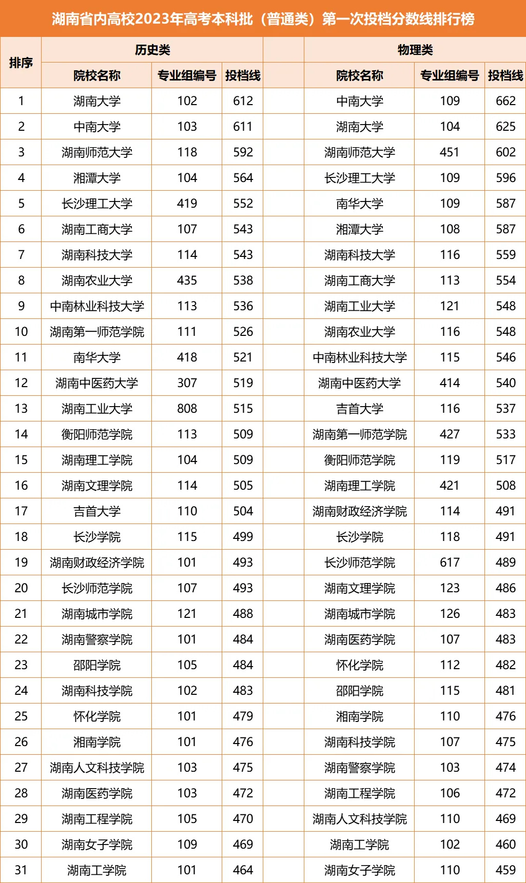 学校人才培养质量、综合办学实力深得社会认可。在招生计划大幅增加的背景下,学校录取投档线基本保持稳定,整体生源质量稳中有升。学校2023年在湘本科批次历史类投档最高分530,位次11482名,历史类平均成绩487分,位次25370名,相比22年位次略有上升;物理类投档最高分546,位次44368名,相比22年位次略有上升,物理类平均成绩488分,位次92820名。