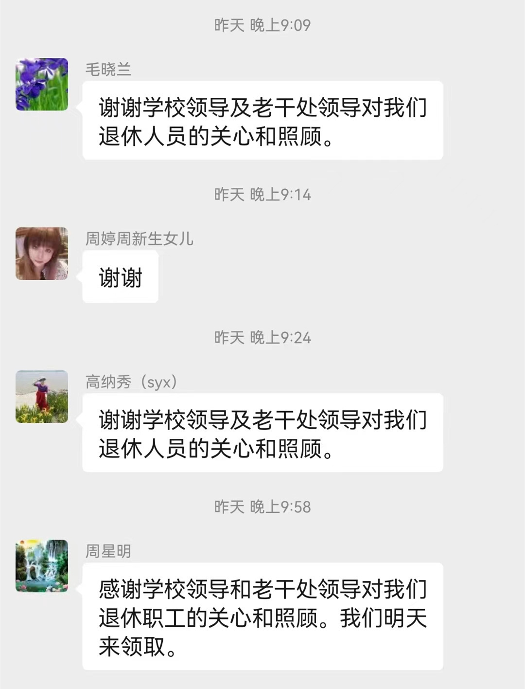 老同志们通过微信表达对学校的感谢